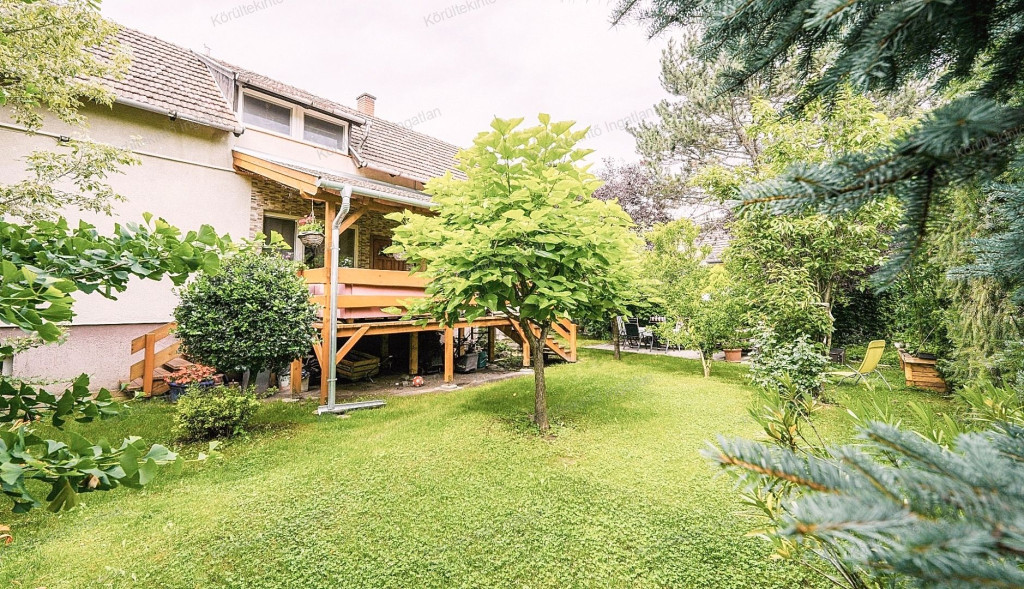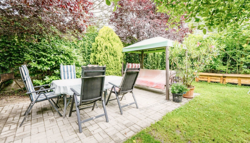 A kert rendkívül hangulatos, árnyat adó fákkal, napozásra alkalmas füves résszel, kerti tárolóval.